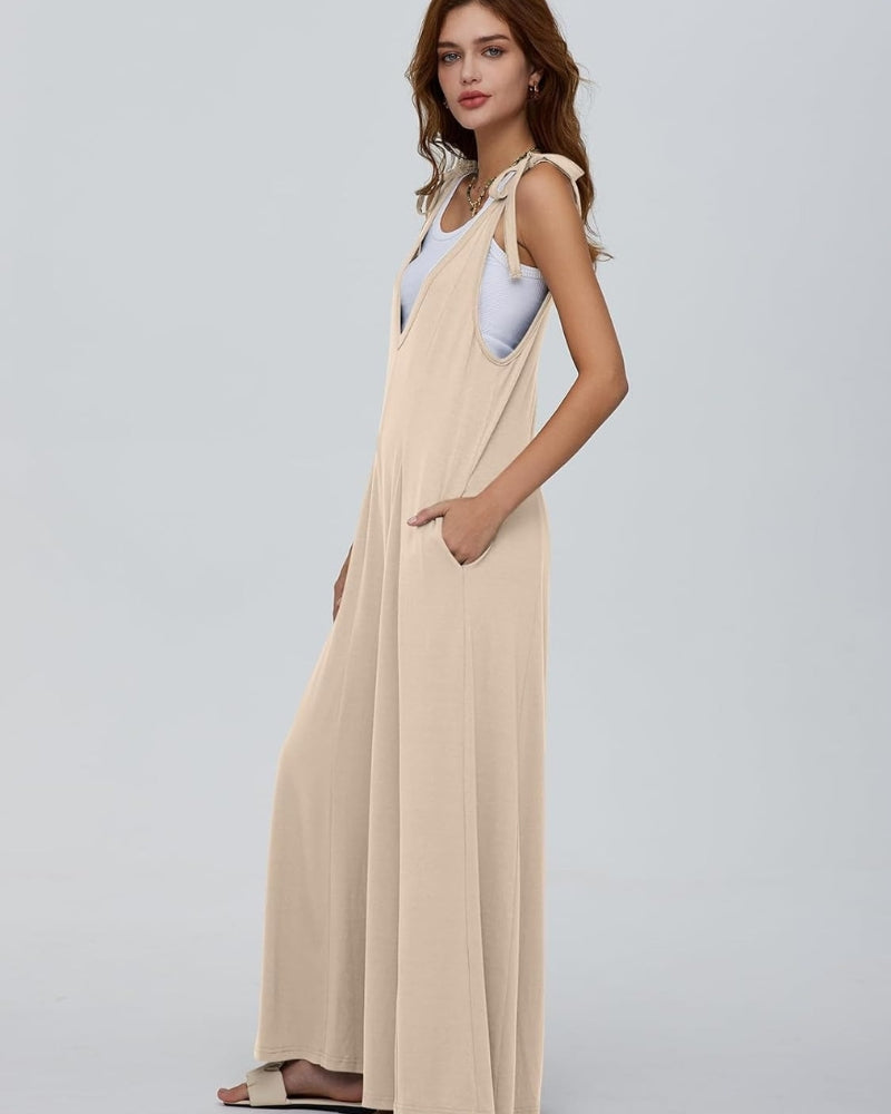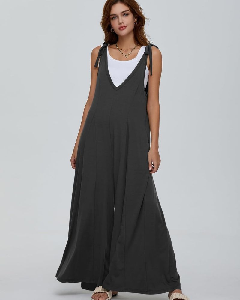Featuring a free-flowing wide-leg silhouette, soft fabric, and charming tie-shoulder straps, this jumpsuit brings together comfort and bohemian flair.